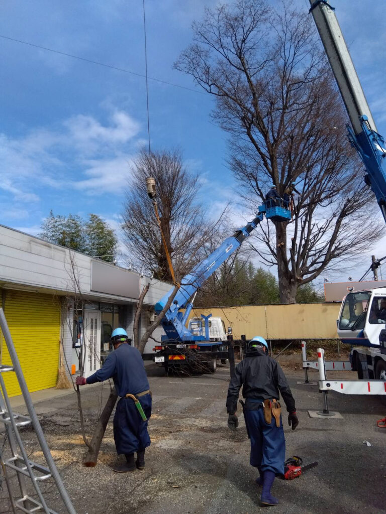 県道に隣接して交通量も多いところなので、チェーンソーのおがくず飛散にも注意をはらい丁寧に施工しました。