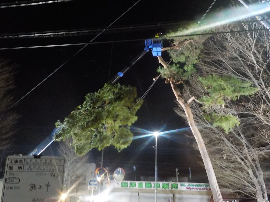 川越街道の中央分離帯に長年にわたり育ったアカマツですが、樹形が著しく傾いて倒木の可能性が生じたため、埼玉県川越県土整備事務所より受注して伐採することとなりました。交通量が多い幹線道路のため、交通渋滞の懸念から作業は夜間に実施されました。