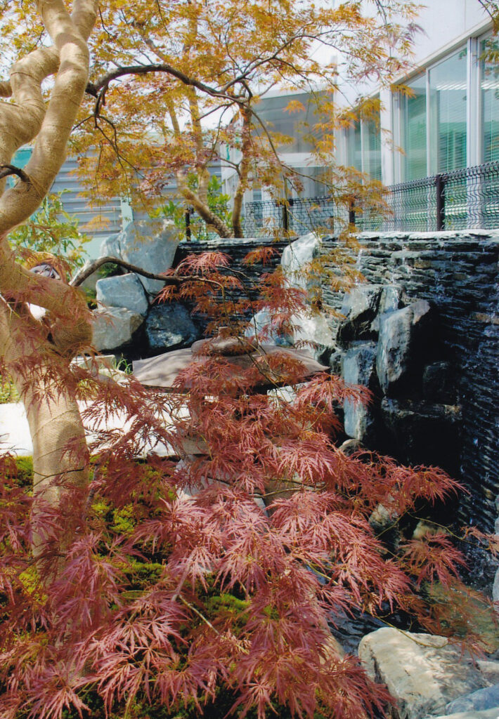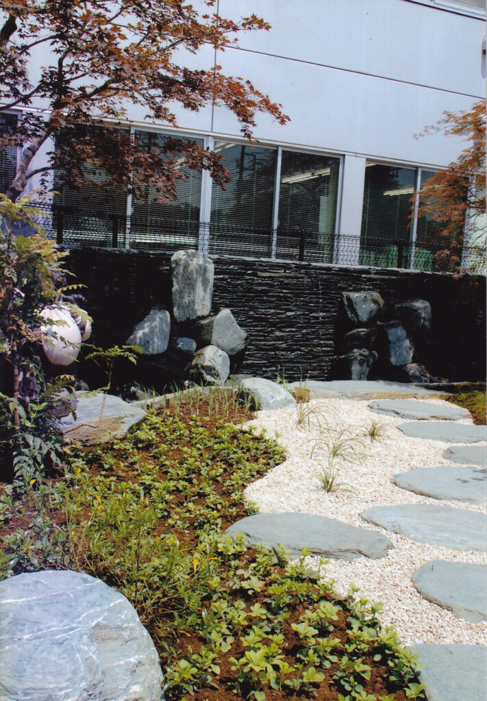 日ごろから懇意にしていただいている小笠原土木工業株式会社様※1より依頼を受け、本社の前庭としてカスケードを含む池泉庭園を作庭しました。