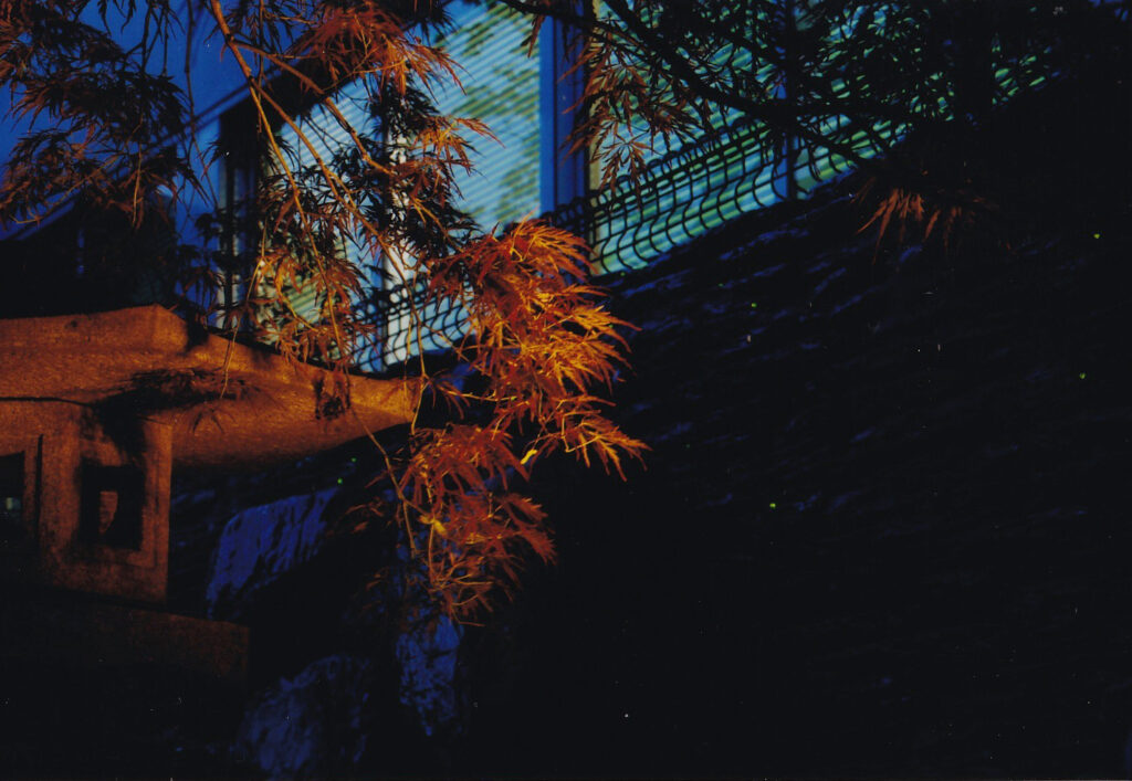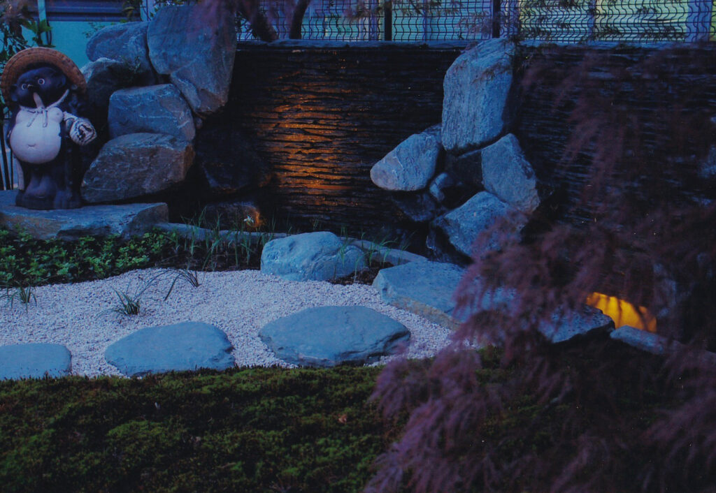 カスケードには、夜には蛍に見立てた防水ライトを施してライティングのアクセントも施しました。