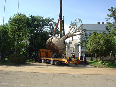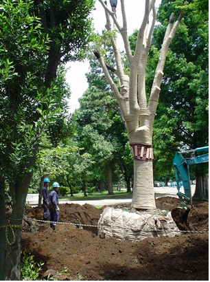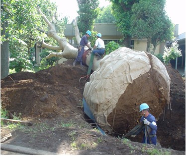 特に大径木の移殖においては、移植の数年前から「根回し」を行うため、前もって余裕のある期間が必要となります。そのような段取り期間をかけてでも、伐採植替えではなく移植をする価値がある大切な樹木を極力生かせるように、当社でも移殖技術の向上を常にはかり、樹木に対しての敬意と誠意をながら施工をしています。