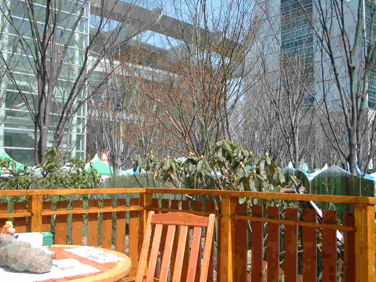 ウッドデッキと流れ石組み(浅間石)を中心としたレイアウトで正面にそびえるNTTドコモのビルを槍ヶ岳に見立てました。