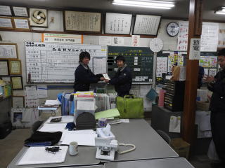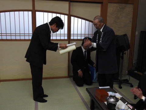 入籍日の朝、業務部長(左)からお祝いを贈呈しました。