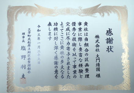 本社のある埼玉県入間郡三芳町に関連する土地区画整理事業において、三芳町北松原土地区画整理組合理事長より感謝状を戴きました。