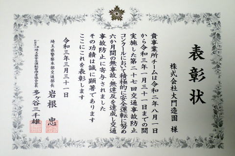 全社員が無事故無違反を達成し、県警交通部長より表彰を戴きました。